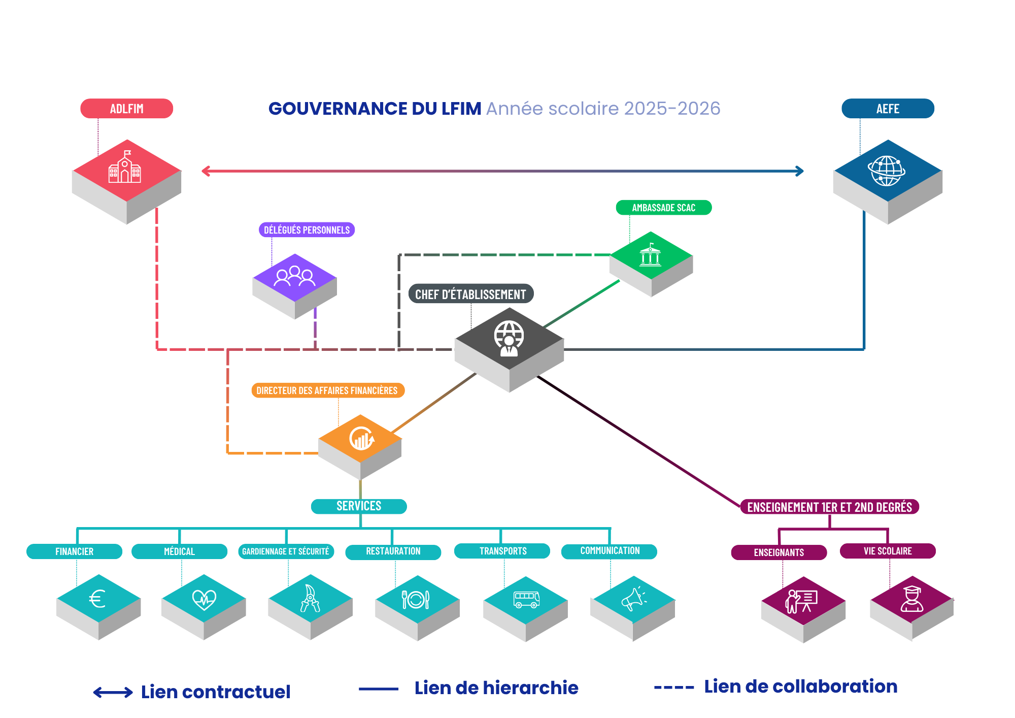 The Management Committee is its representative and management body. It is made up of members who act on a voluntary basis without being able, under any circumstances, to be remunerated for the exercise of their functions. The statutes of ADLFIM can be consulted freely. The establishment's budget, drawn up by the administrative and financial director, assisted by the head of the establishment and the director of primary education, and approved by the Management Committee, is subject to the compliant visa of the AEFE.